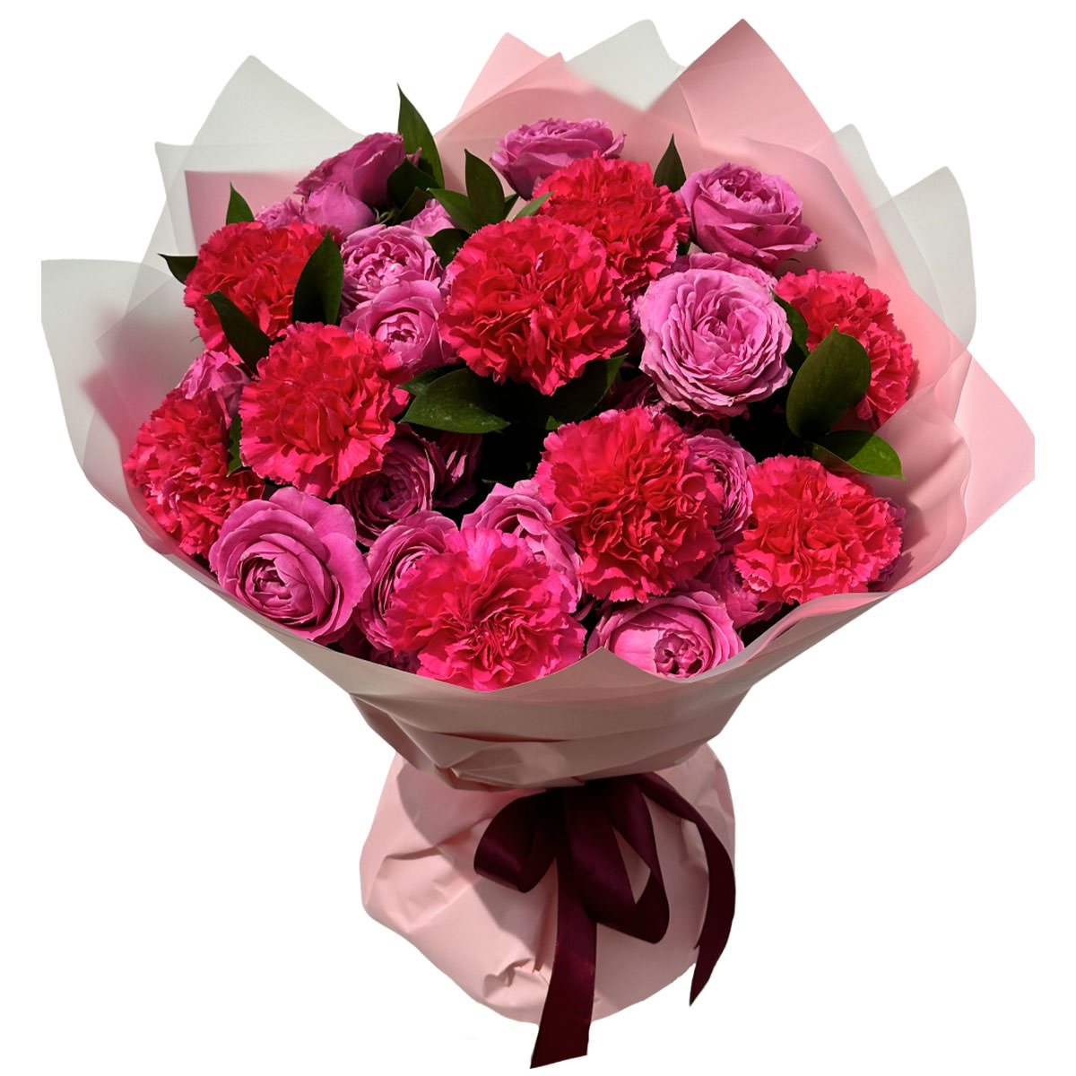 Роза одноголовая розовая, диантус бордовый. Упаковка (лента, пленка, крафт, сетка, пленка матовая)