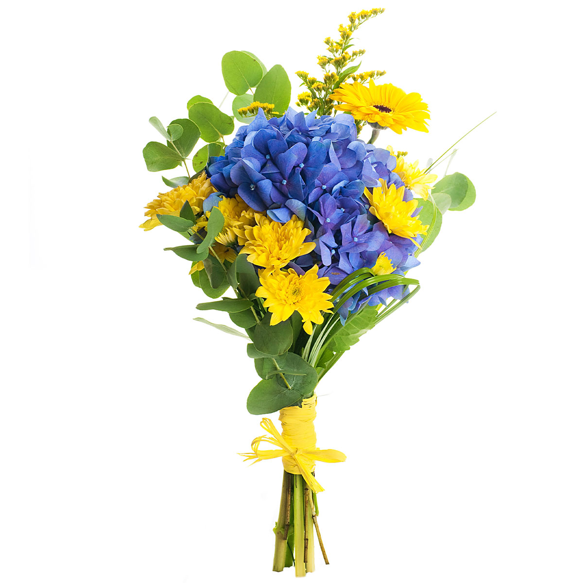 Гортензия голубая, хризантема кустовая желтая, эвкалипт, листья пальмы (робелини).Упаковка (лента, пленка, крафт, сетка, пленка матовая)