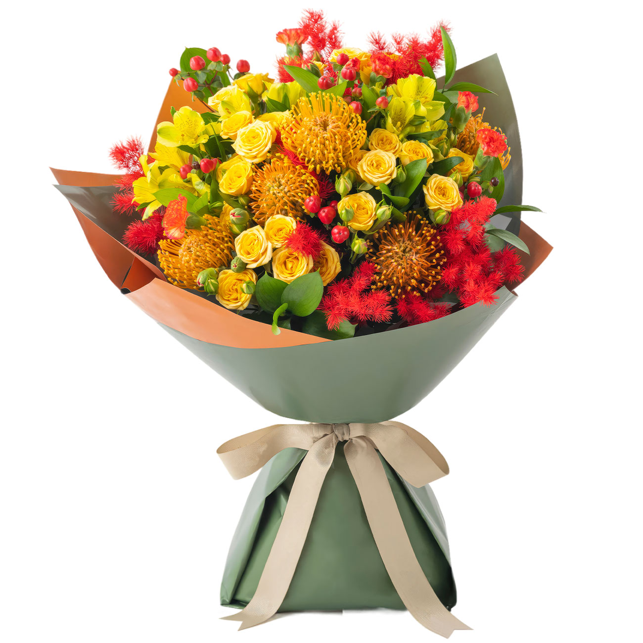 Роза кутсовая желтая, леукоспермум, альстромерия желтая, зелень. Упаковка (лента, пленка, крафт, сетка, пленка матовая)