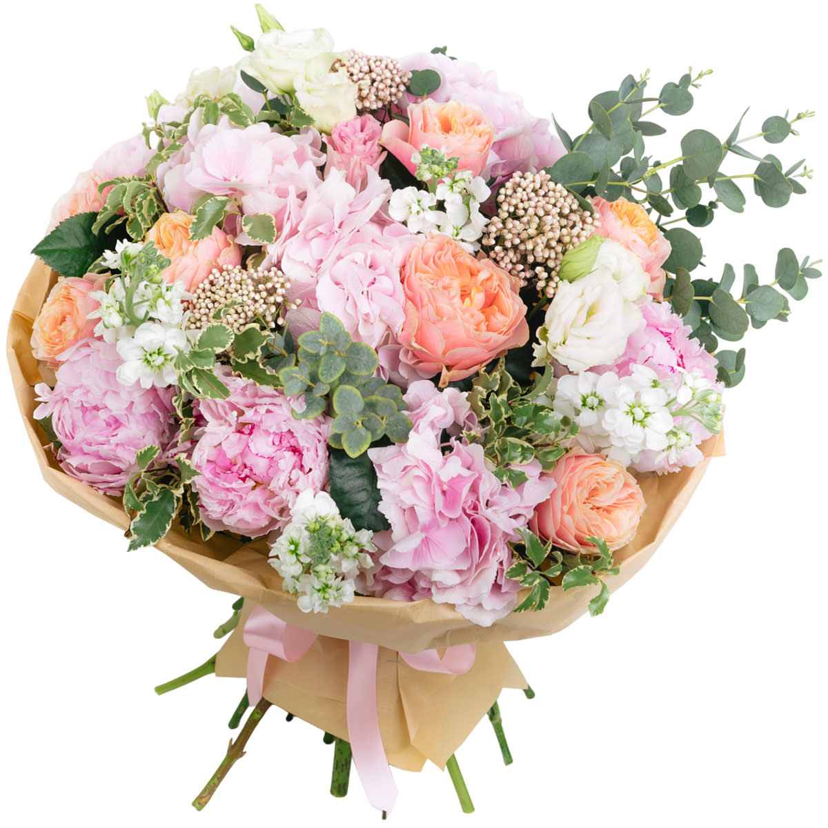 Пион розовый, роза пионовидная одноголовая персиковая, гортензия розовая, маттиола белая, эустома белая, озотамнус, эвкалипт, зелень. Упаковка (лента, пленка, крафт, сетка, пленка матовая)