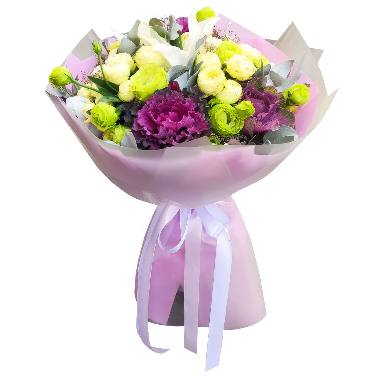 Брассика, роза кустовая пионовидная, эустома зеленая, лилия белая, эвкалипт. Упаковка (лента, пленка, крафт, сетка, пленка матовая)
