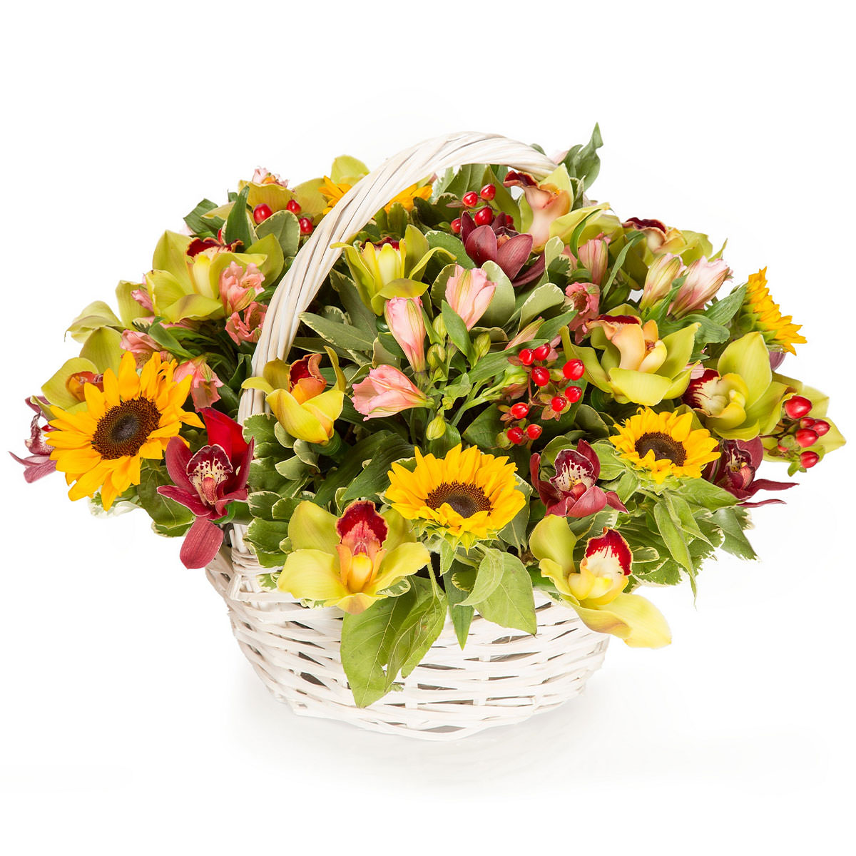 Подсолнух, орхидея желтая и красная, альстромерия розовая, гиперикум. Упаковка (Корзина, оазис, ящик).