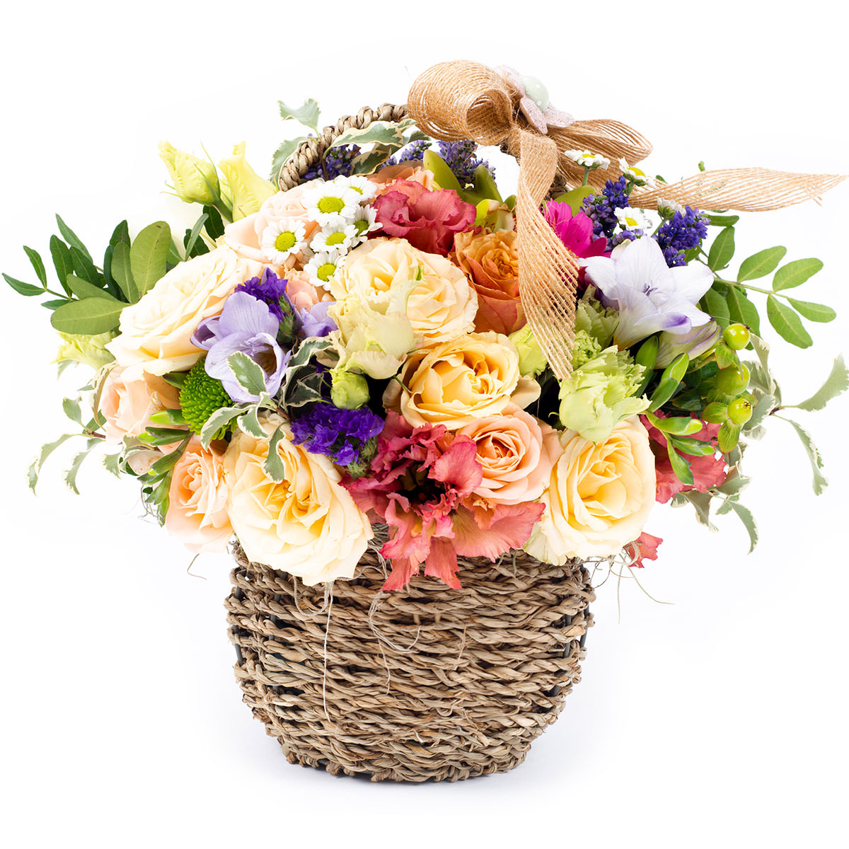 Роза одноголовая чайная, ромашка, фрезия фиолетовая, эустома красная, хризантема кустовая зеленая, гиперикум, статица. Упаковка (Корзина, оазис, ящик).