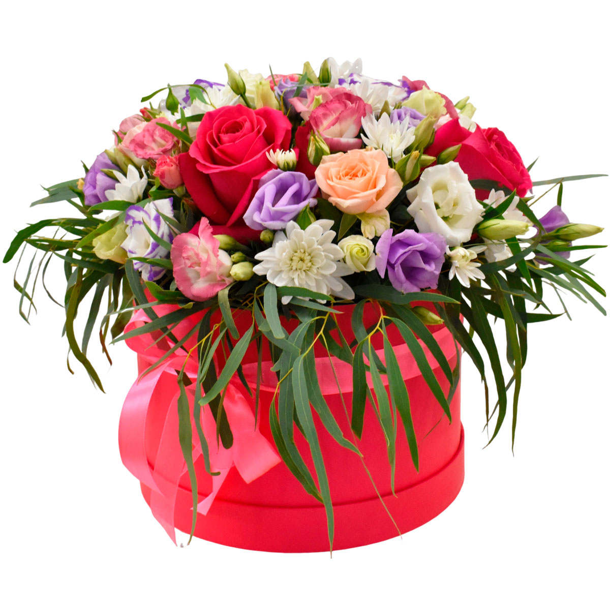 Роза одноголовая красная, эустома белая, розовая и сиреневая, хризантема кустовая белая, зелень. Упаковка (шляпная коробка, квадратный бокс, коробка сердце, оазис)