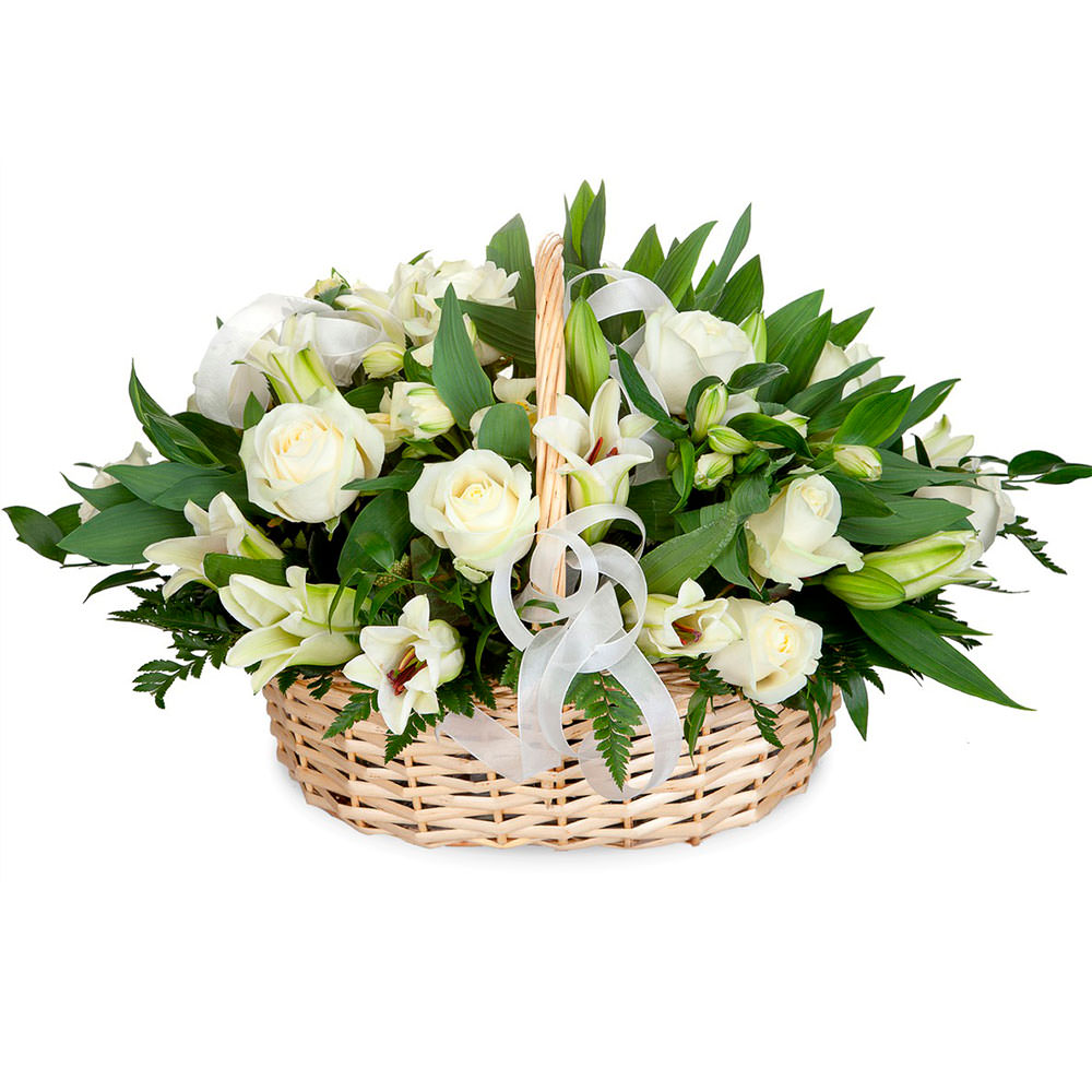 Роза одноголовая белая, лилия белая, папоротник. Упаковка (Корзина, оазис).