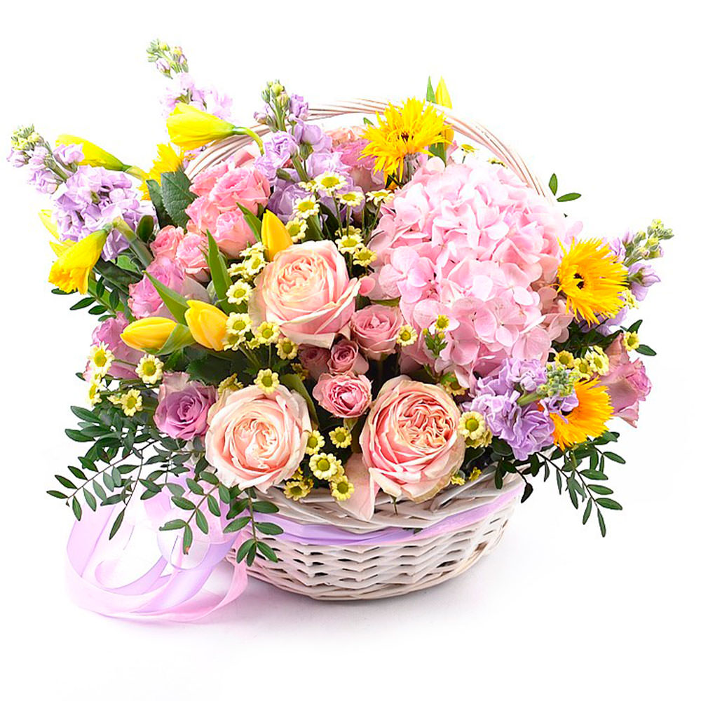Гербера желтая, роза одноголовая розовая, роза кустовая розовая, тюльпан желтый, нарцисс, танацетум, фисташка, маттиола сиреневая, гортензия розовая, ромашка. Упаковка (Корзина, оазис).