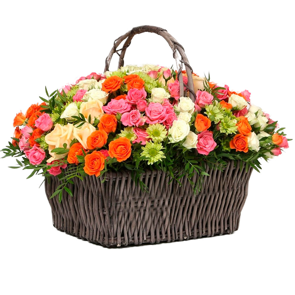 Роза кустовая микс (белая, оранжевая, розовая), хризантема кустовая зеленая, фисташка. Упаковка (Корзина, оазис).